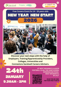 Get your FREE tickets now to thisĀ amazing event onSat 24 January 2026 9.30pm – 2pmat the Hawthorns.Discover your next steps with the help of employers, training/apprenticeship providers, colleges, Universities and Connexions Sandwell Careers Advisers.To register please click on this link and choose your time slothttps://www.ticketsource.co.uk/connexions-sandwell